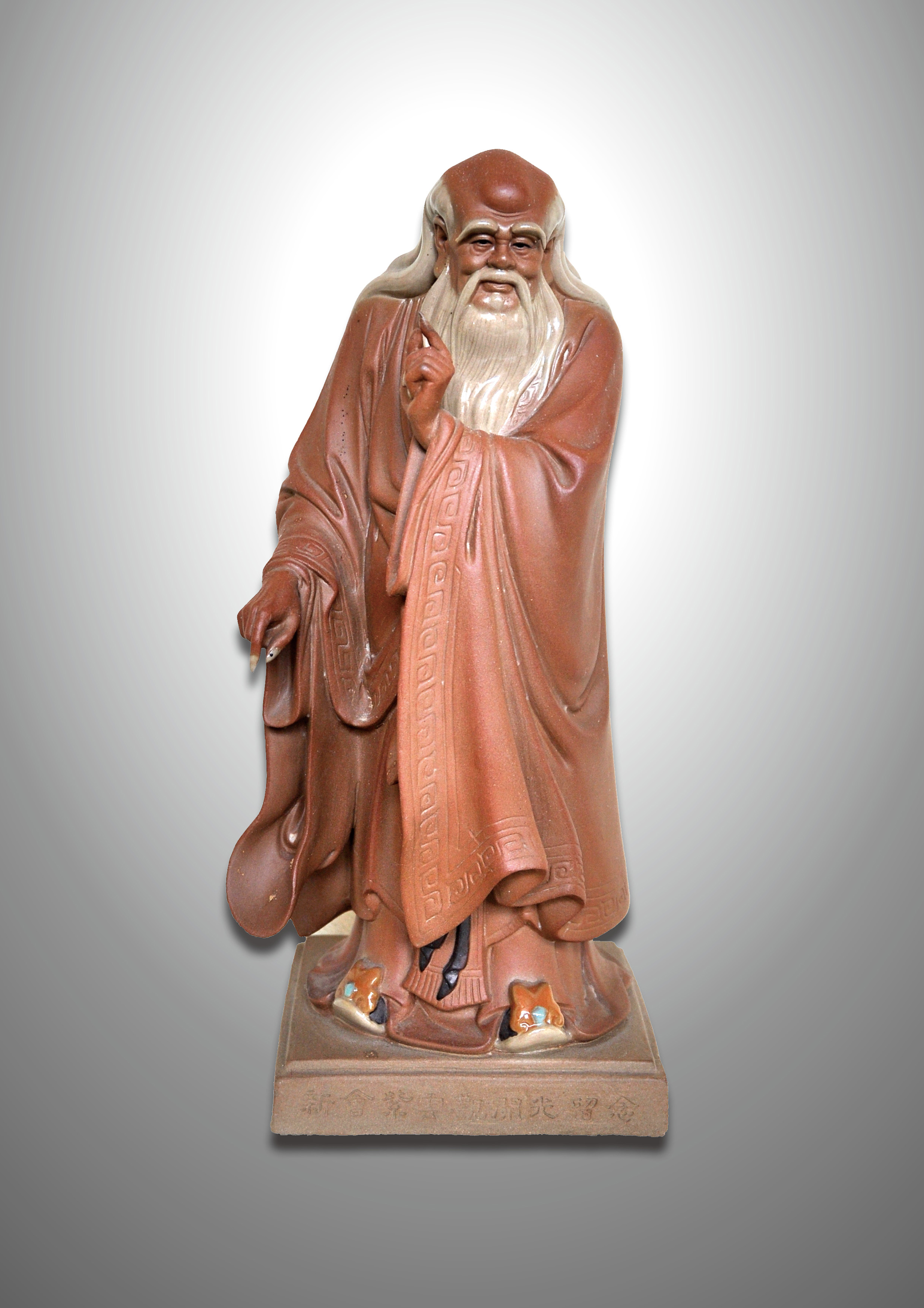 此件塑像为老子像。塑像中老子面部表情安定自若,须发皆白并呈现出飘动状。眼神把握极为准确,展现出老子精深思索,有大智大慧之意。衣饰鞋履、手部指甲细节表现巧妙,达到栩栩如生之境。