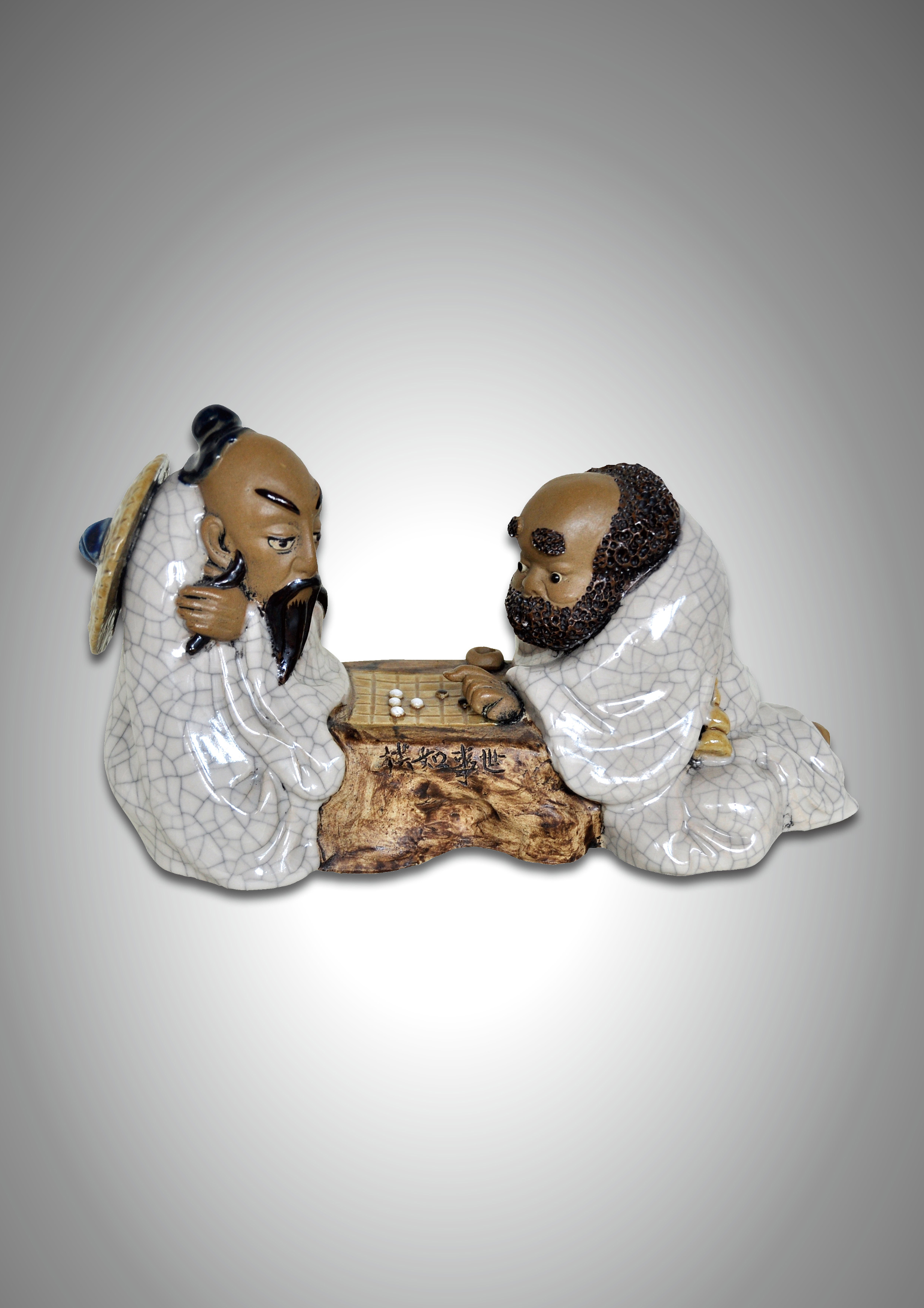 此件石湾陶塑造了两位先生下棋的场景,人物造型生动传神,面部表情露出聚精会神思考状,表明正全情投入在这一棋局里。人物眉毛与胡子的处理更加增添人物的性格特征。此件物品的胎釉浑厚朴实,有很高的艺术美感和科学成就。造型和釉色搭配得很和谐。作品名《世事如棋》也很耐人寻味。