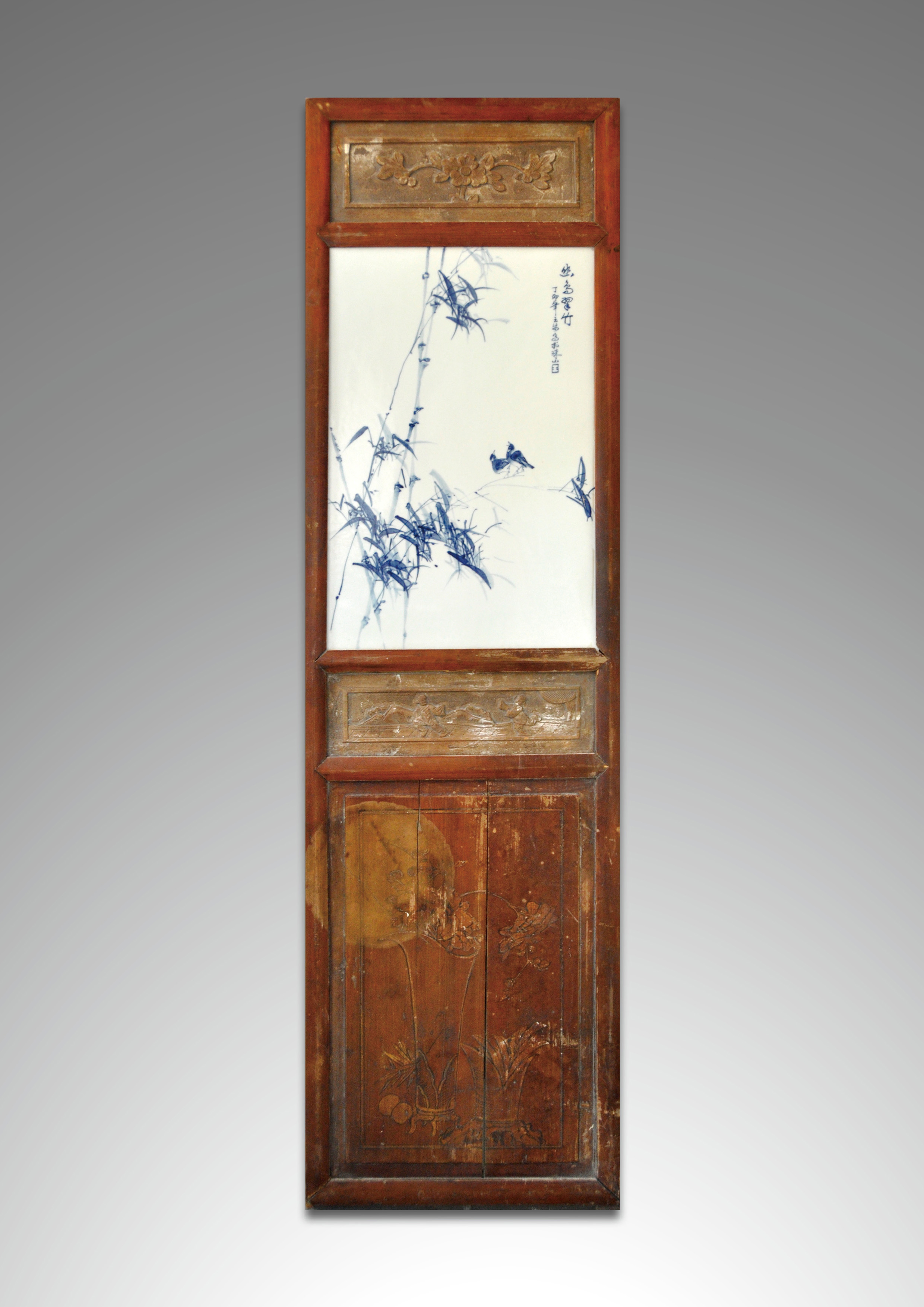 此幅为四扇屏风《竹鸟屏风》之一,此扇高143cm,宽38.5cm,厚3cm。其中瓷版画高58cm,宽30.5cm,厚3cm,为王步1927年所作。画面虚实、浓淡、疏密、轻重、长短、动静,各有法度。通体以青花绘竹林,生意盎然,达到形神兼备的艺术境界,是木雕花嵌板与青花竹叶的完美结合,乃为天合之作。