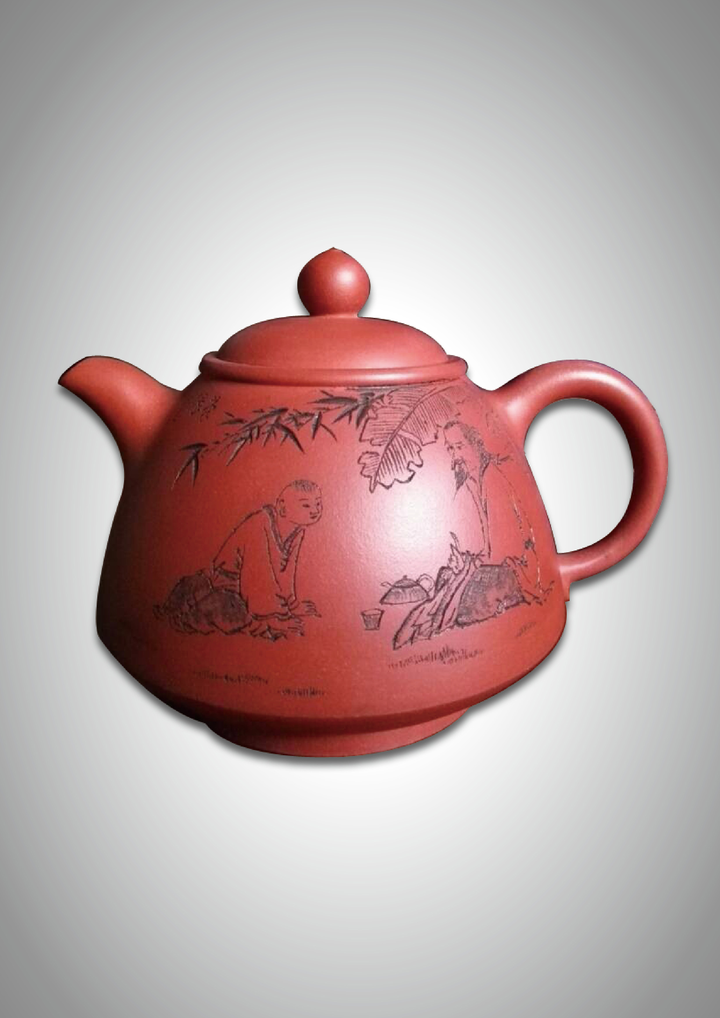 此件紫砂壶是李建军的作品。此壶身呈梯形,曲线柔和流畅,造型朴拙仿古。壶身八字造型,显现简朴大方的气度。壶身字画,内容生动有趣,人物植物器物表现出悠然之态,与壶巧妙融合。
