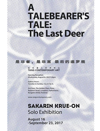 展览介绍: 当代唐人艺术中心曼谷空间将于2017年8月16日至9月23日举办萨卡琳·克鲁昂(SakrinKrue-On)的个展《是非者,是非言——最后的暹罗鹿》,本次个展延续萨卡琳·克鲁昂一贯的观念艺术创作脉络,于泰国传统文明中汲取灵感,反应当今泰国在全球化语境中所面临的危机与挑战。