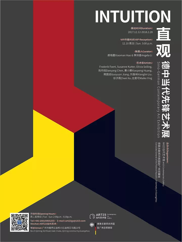 展览介绍: 本次展览由德意志联邦共和国驻广州总领事馆和Art23当代艺术馆主办,邀请了来自德国与中国的9位优秀当代艺术家参与。他们分别是Frederik Foert, Susanne Kutter, Olivia Seiling, 陈丹阳、黄小鹏、蒋国远、刘香林、徐子薇、应麦可。展出的作品涉及装置、影像、雕塑、绘画、行为等各大视觉艺术门类。