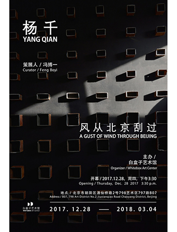 展览介绍: 由白盒子艺术馆主办,冯博一策展的“风从北京刮过——杨千个展”将于2017年12月28日-2018年3月4日在北京798艺术区白盒子艺术馆举行。